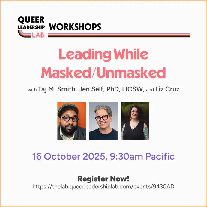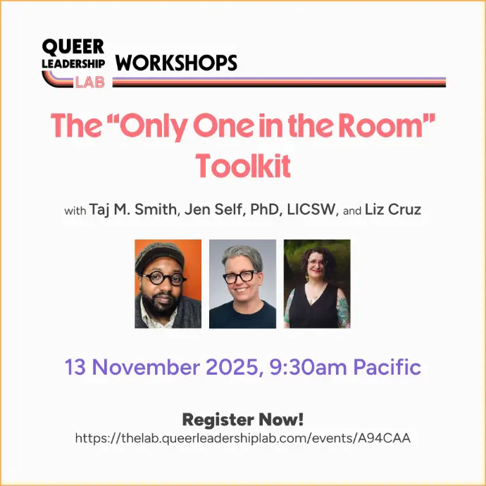 In this time of…well, all of this, hostility and division can make it hard to show up as our full selves. For queer leaders, showing up as “us” can feel both urgently important and unsafe. (How complicated is that?) In this 90-minute online workshop, we offer a space to reflect on how we balance authenticity with safety in our leadership.
